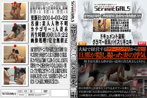 夫婦で経営するクリーニング店から流出した妻の浮気映像!店の中に常連客を上がり込ませていた妻に不信感を抱いた旦那は部屋にカメラを仕込んで録画!そこ に映っていたのは、よく来店する常連客をソファーに座らせイチャついていた。しかもお互い全裸になって男と卑猥なことまでやっていた妻。よく確認すると相 手は店の近所に住む男だったのだ。今は店を閉めているクリーニング店だが、そこから流出した映像を是非ご覧ください。 無修正 メーカー 和物 素人 女優 盗撮