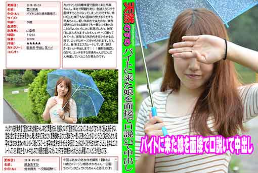 カメラマン技術職希望で面接に来た奈美ちゃん。本社で問題があり、急遽スタジオで面接することになってしまったのですが、特に怪しむ様子もなく面接の受け 答えをする奈美ちゃん。軽い気持ちで来たのか、実務経験もなければ趣味でも一眼レフを触ったことがないということに駄目だしされ、被写体にまわされますw かわいいポーズ撮ってみて~と、被写体の気持ちを分からせる名目で、エッチなポーズをやらされます。どんどん、自体はエスカレートしていき、潮吹き・生ハ メ・中出しまで!!!撮影を確認しながら、エッチをする奈美ちゃんがだんだん興奮していくところが見ものです。 無修正 メーカー 和物 素人 女優